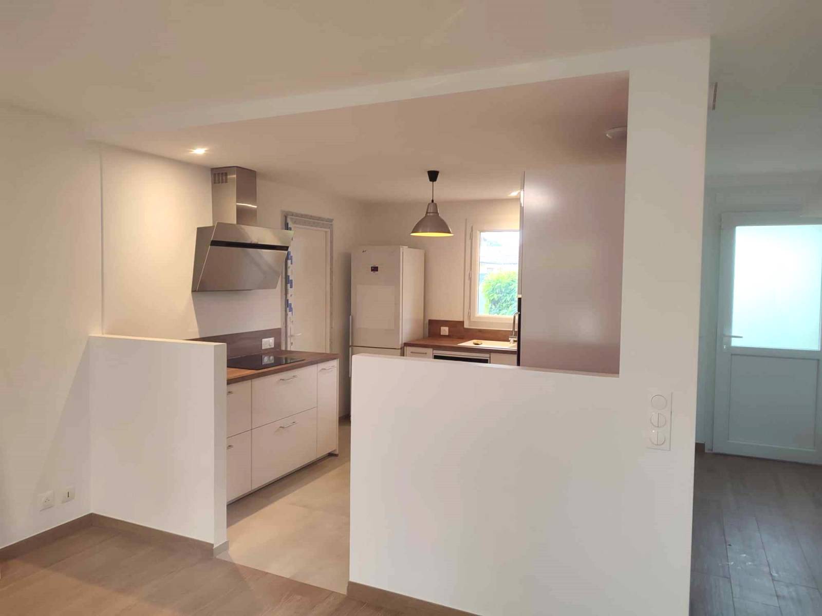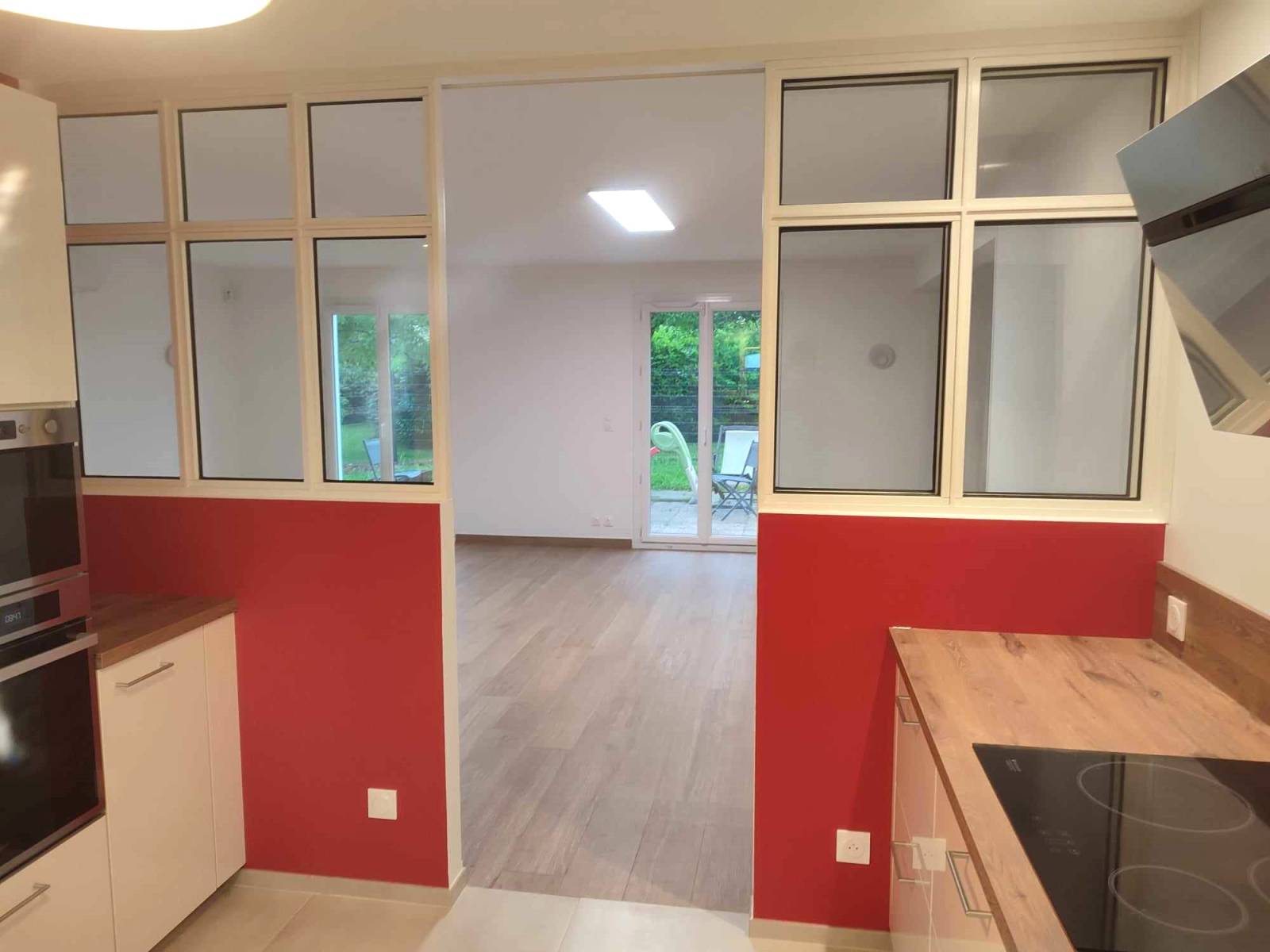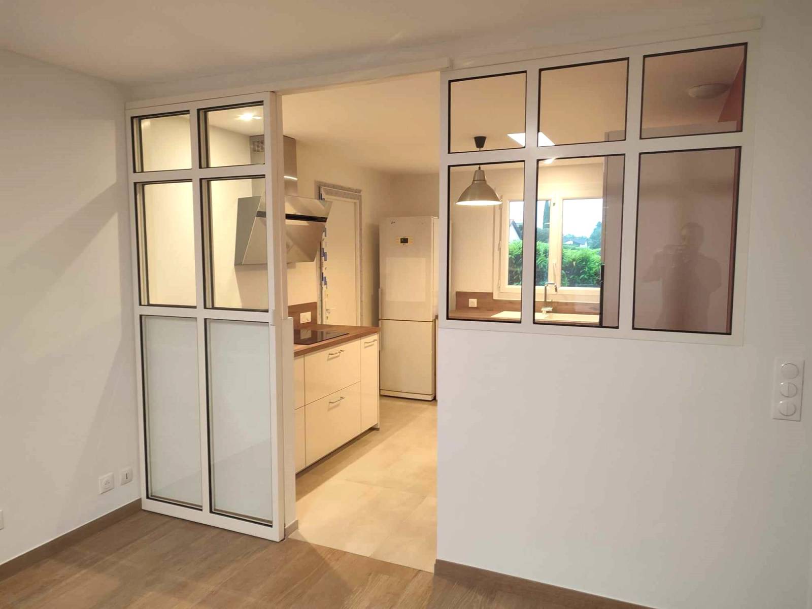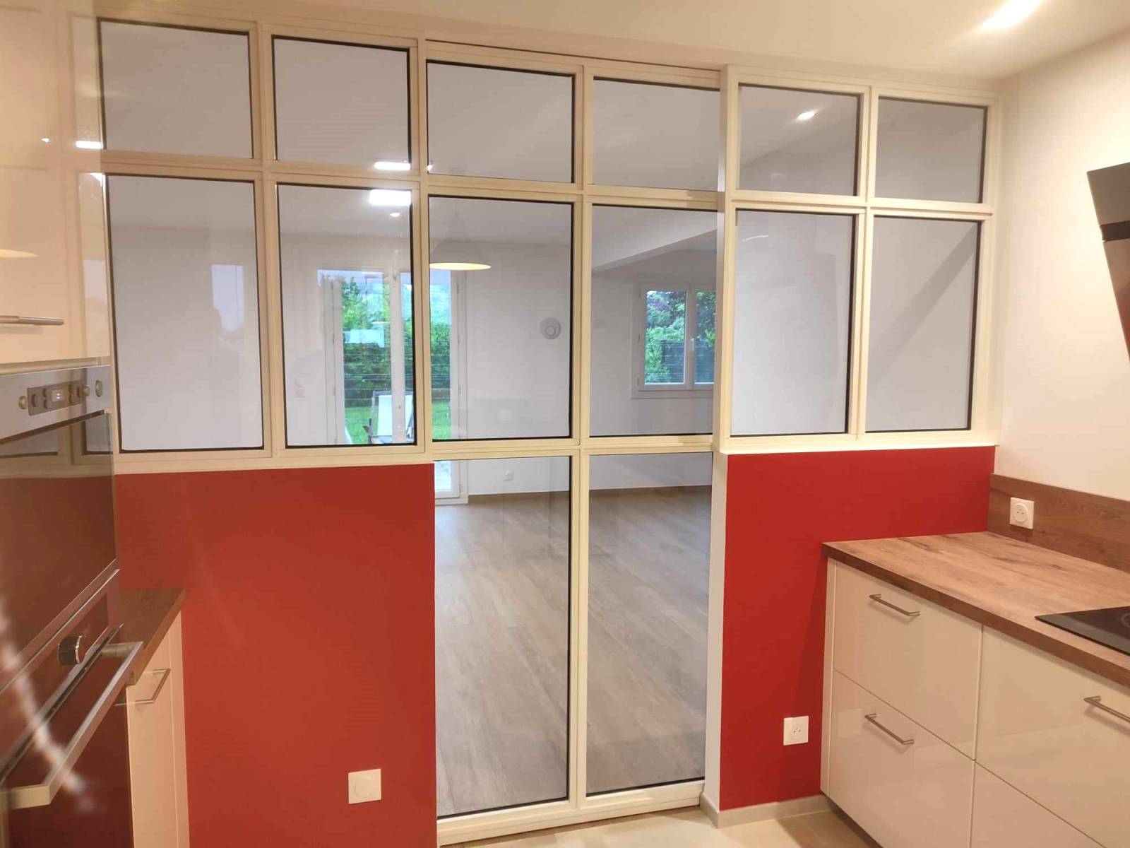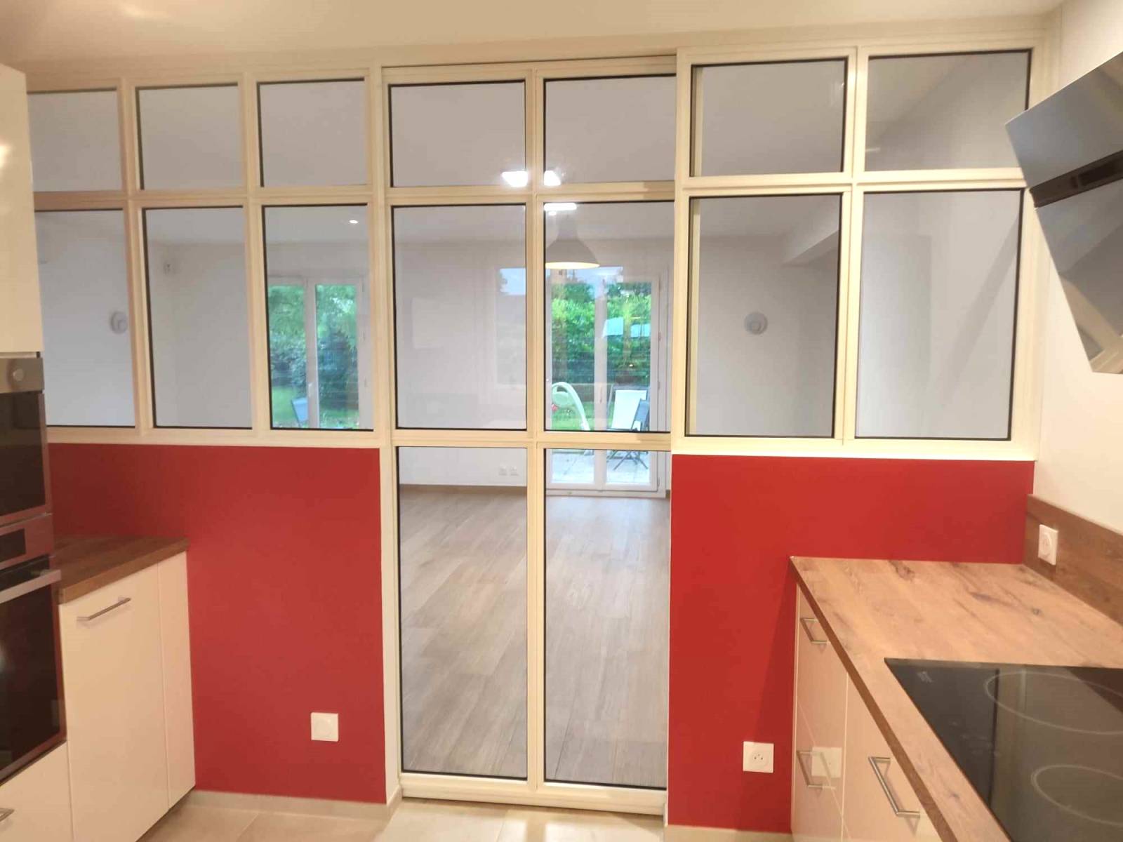 Cette verrière se compose d’un ensemble de cloison vitrée avec une porte coulissante, intégrée sur un sous-bassement en placo, garantissant une séparation élégante tout en préservant la luminosité.