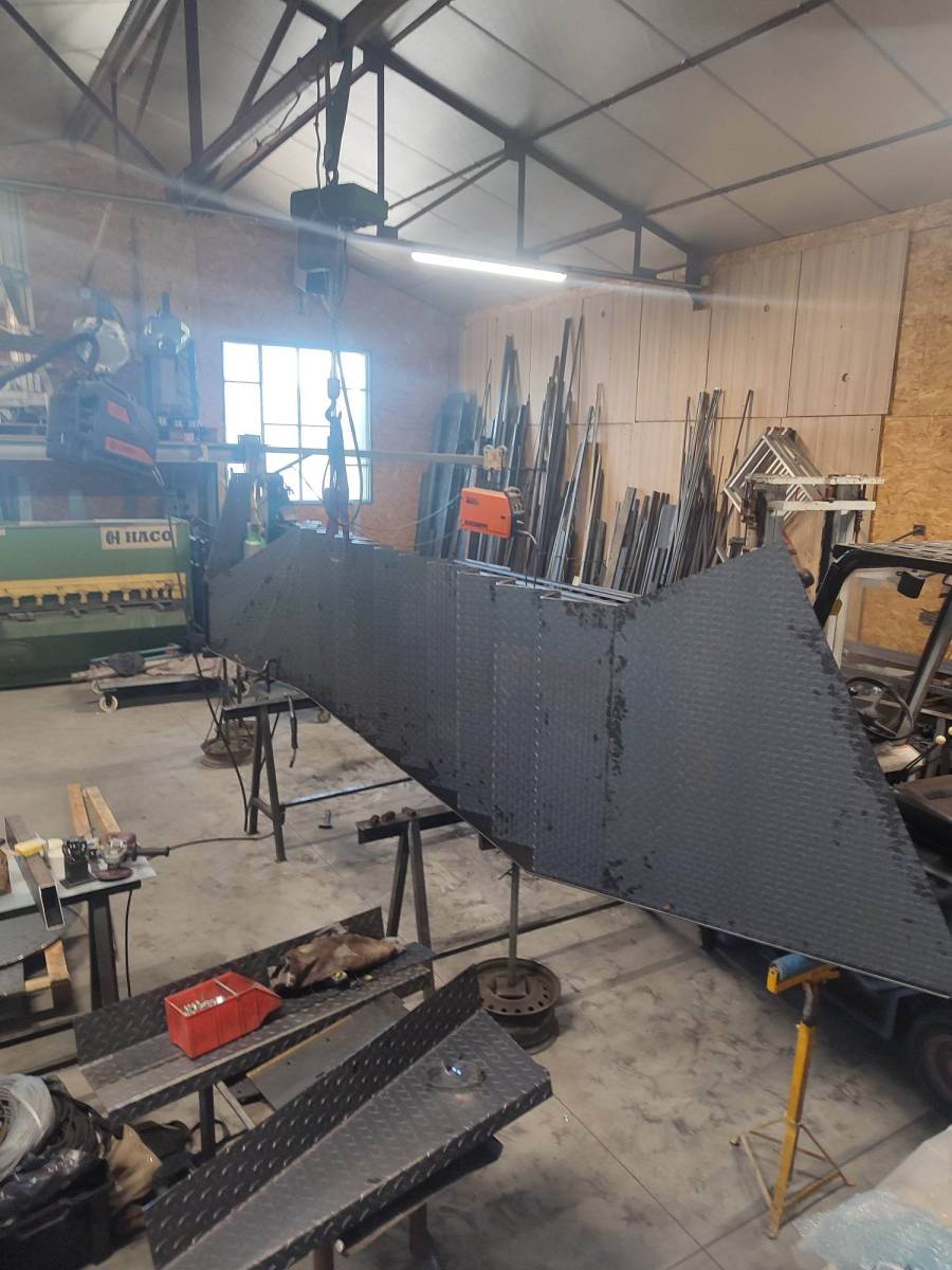 L'escalier, conçu pour accéder à la mezzanine à une hauteur de 2490 mm, présente un design quart tournant. Il est composé de deux limons en épaisseur 8mm, et les marches ainsi que les contremarches sont réalisées en tôles pliées larmées, répondant aux normes anti-dérapantes pour garantir la sécurité des utilisateurs dans un environnement public.